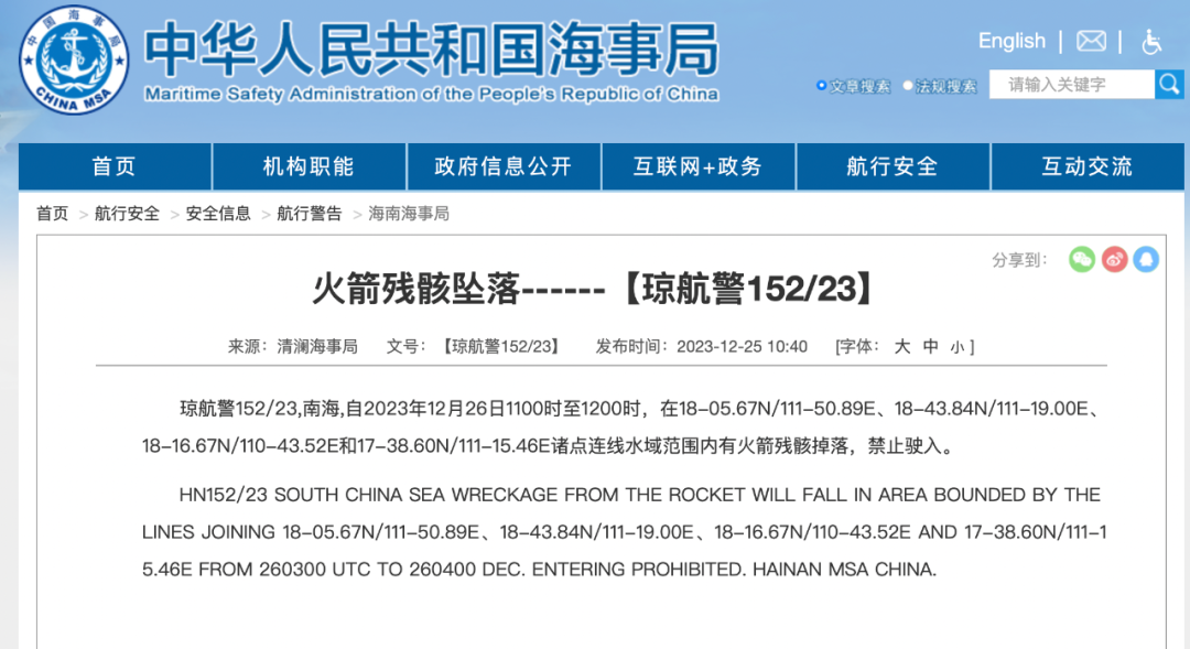 据中国海事局网站消息,清澜海事局发布航行警告,12月26日11时至12时,南海一海域有火箭残骸掉落,禁止驶入。